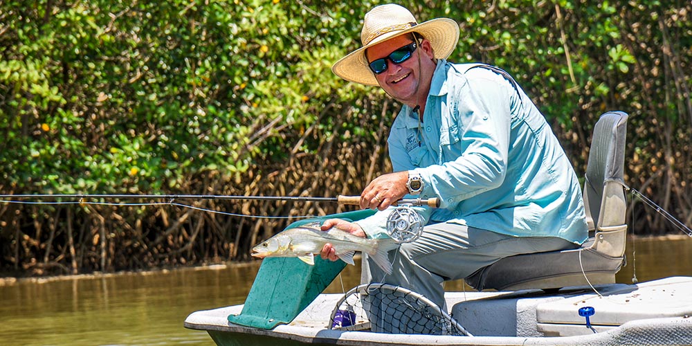 Rafiki offers a full day fishing trip. The stretch of river starts near the lodge, we use a 13′ foot whitewater raft with an oar frame. This boat easily navigates the whitewater and gets fisherman into the deep pools of slower moving water. These waters are prime territory for machacas. The fish are in the piranha family. They fight hard and are clever. Sometime the best way to catch them is to get them mad!